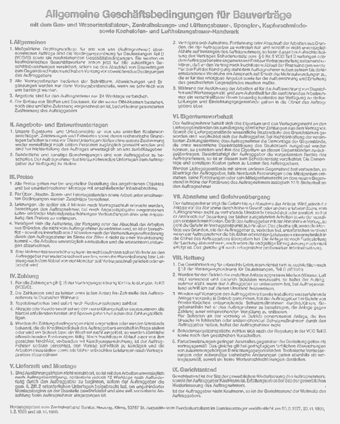 Nachfolgend finden Sie die allgemeinen Geschäftsbedingungen für Bauverträge mit dem Gas- und Wasserinstallateur-, Zentralheizungs- und Lüftungsbauer-, Spengler-, Kupferschmiede- sowie Kachelofen- und Luftheizungsbauer-Handwerk.